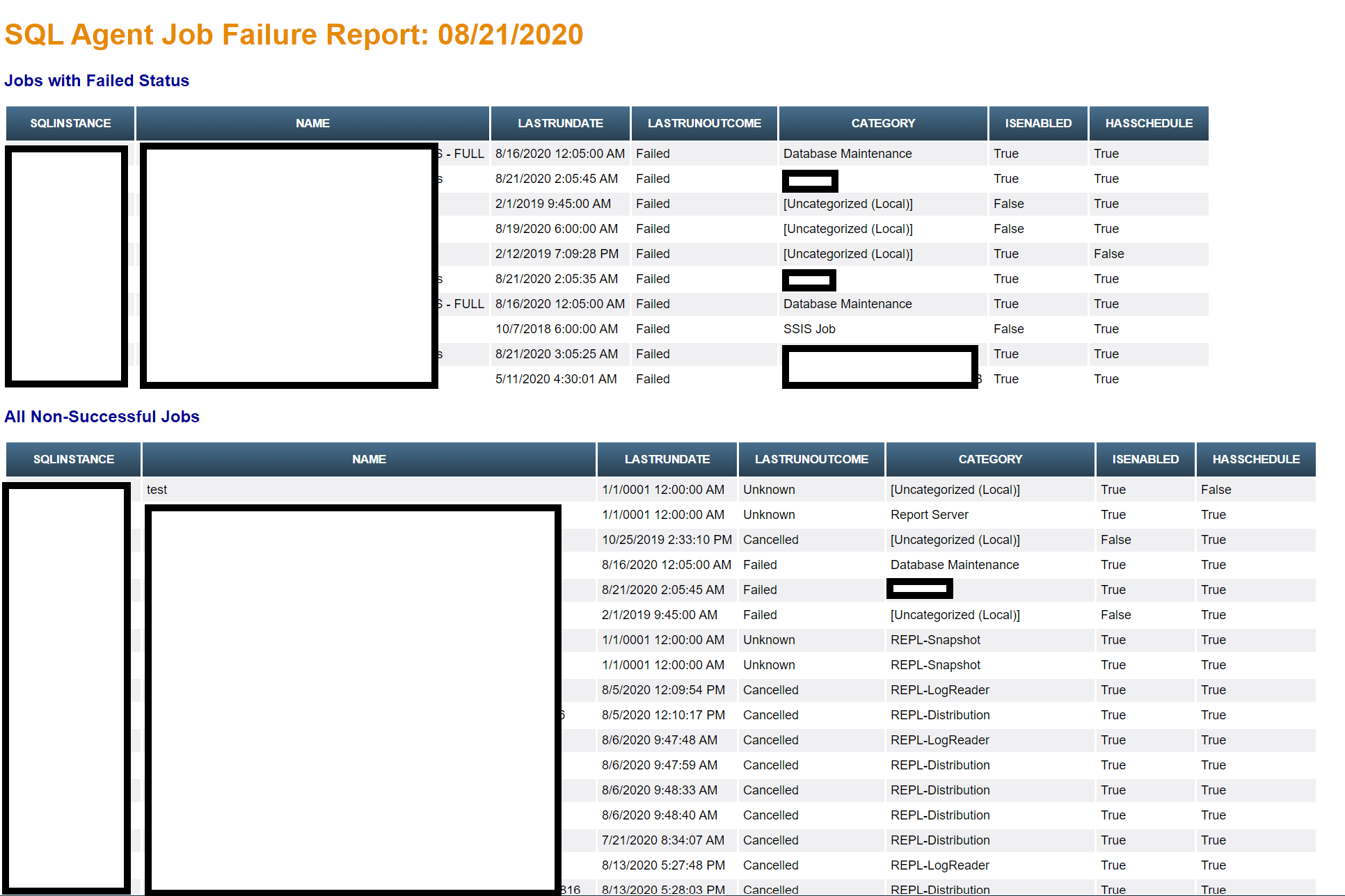 #The command below will combine all the information gathered into a single HTML report $Report = ConvertTo-HTML -Body "$reportInfo $failedJobsOnly $failedJobsAll $failedJobsNoRepl $failedJobsNotFailedSuccess $failedJobsNeverExecuted $failedJobsNeverExecutedDisabled $failedJobsNeverExecutedNoSchedule" ` -Title "Failed SQL Agent Job Report" -Head $header -PostContent "<p id='CreationDate'>Creation Date: $today</p>" #The command below will generate the report to an HTML file $Report | Out-File "C:\Temp\FailedJobsReport.html" |