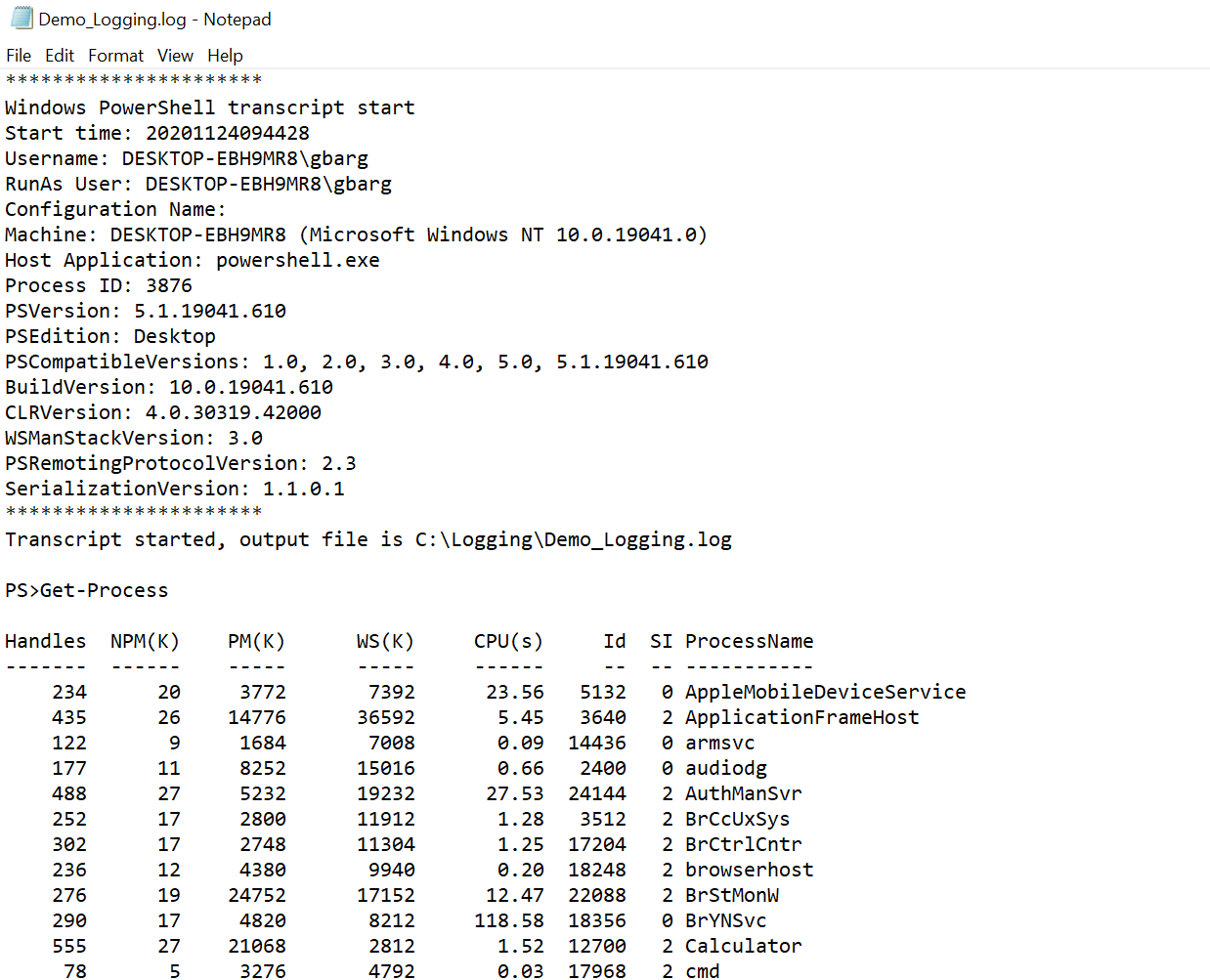 Start-Transcript -Path "C:\Logging\Demo_Logging.log" Get-Process Stop-Transcript |